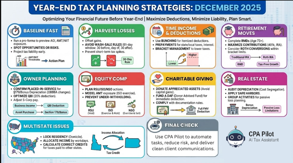 December wins come from smart sequencing, clean documentation, and crisp client comms. Use this playbook to baseline fast, time income/deductions, harvest with guardrails, tune QBI/§179/bonus, and button up equity comp, charity, real estate, and multistate.